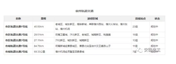 市域轨道交通2号线(S2线):由宿州机场经灵璧至泗县县城。加强灵璧、泗县县城与中心城区之间的联系,主要经由S303,线路全长69.33公里,设车站7座。