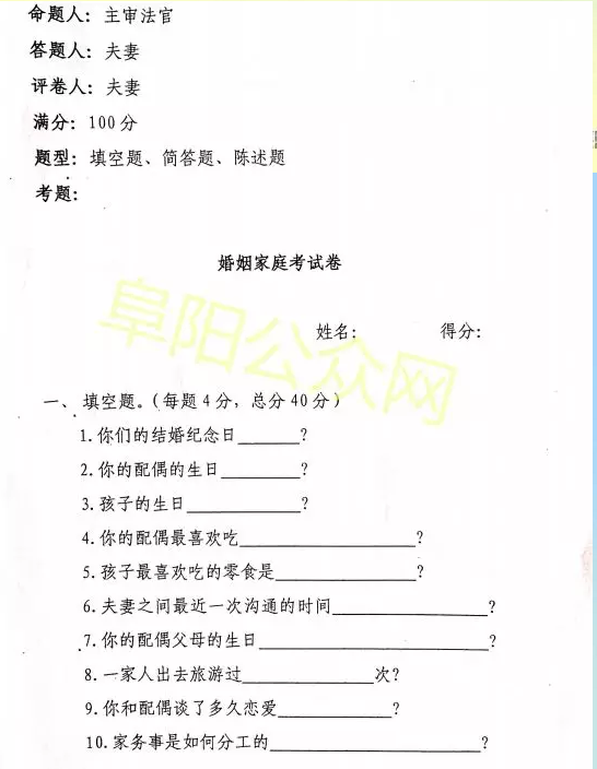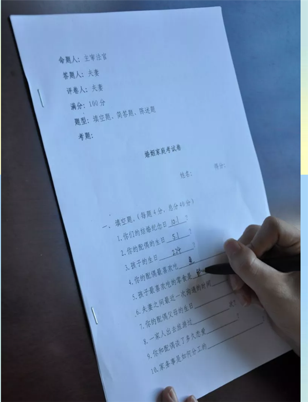 上学要考试、找工作要考试……但你听过离婚也要考试吗?7月16日,太和法院家事审判庭在处理一起离婚案件时,首次在调解过程中引入“婚姻试卷”。女子施某诉孙某离婚纠纷一案,主审法官组织双方当事人进行开庭前调